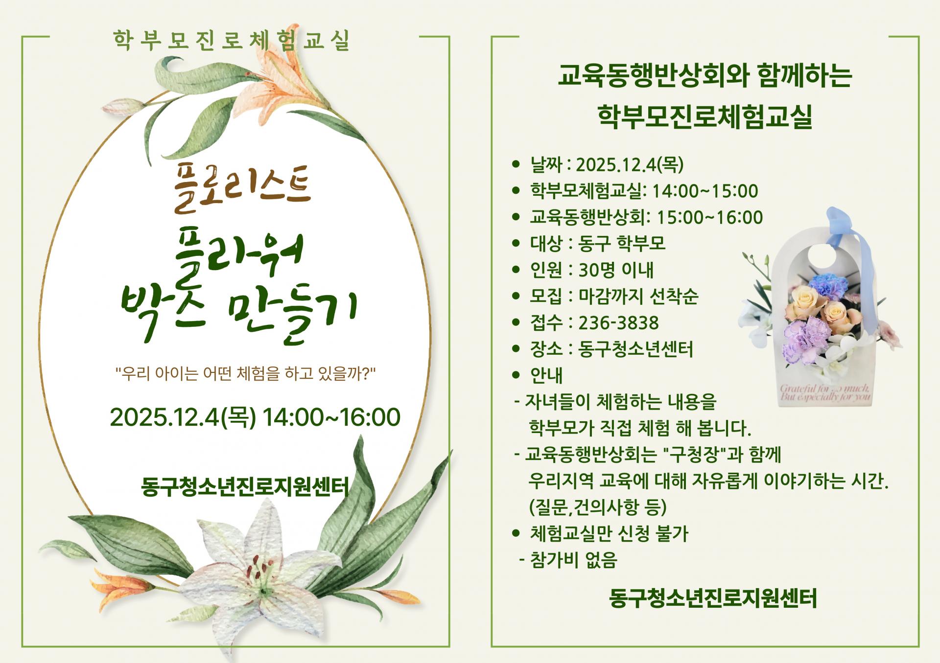 동구청소년진로지원센터에서 '2025 하반기 교육동행반상회와 함께하는 학부모진로체험교실' 신청자를 아래와 같이 모집합니다.